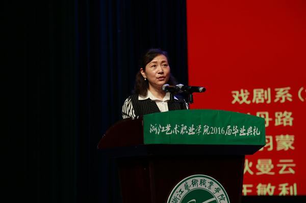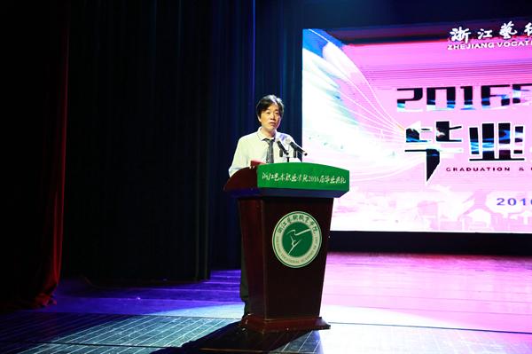 院长黄杭娟在毕业典礼上致辞。她寄语每一位毕业生,学院是我们共同奋斗的家园,你们为她的付出、你们洒下的汗水,已经融入到她的每一寸地方,永远不会消失。正是因为有一代一代像你们这样的优秀学子,学院这棵大树才会枝繁叶茂、四季常青。2015年是学院60周年校庆之年,2016届毕业生是60年校庆后的第一批毕业生,共同见证了母校的辉煌。希望毕业生们无论何时何地都不要忘记母校,不要忘记“求真 尚美 精艺 修为”的校训,砥砺品行,追求卓越,打造一片属于自己的更广阔的天地。