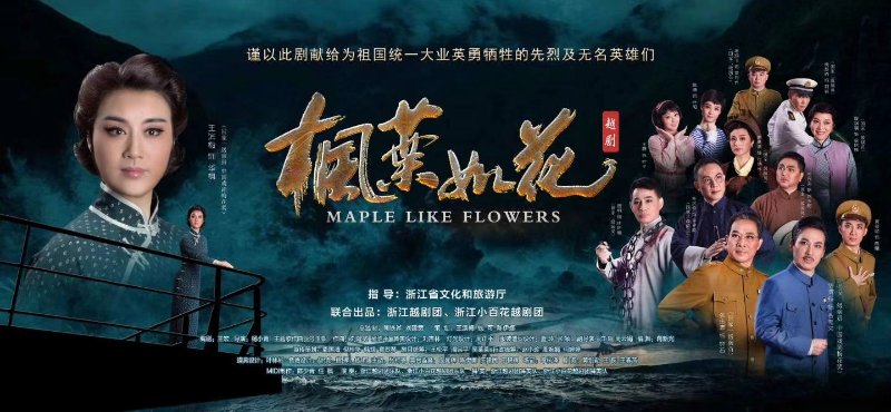 越剧《枫叶如花》是根据中国共产党隐蔽战线中浙江籍“红色女特工”朱枫烈士事迹改编而成的越剧现代戏,表现了一个共产党员大无畏的革命精神。该剧由总政话剧团团长王宏担任编剧,著名导演杨小青执导。刘杏林、蓝玲、周正平、刘建宽、杨浩平等各艺术领域大腕组成了一流的主创阵容。国家一级演员、中国戏剧梅花奖得主王滨梅领衔主演女一号华枫,国家一级演员、中国戏剧梅花奖得主华渭强,以及张伟忠、周明、朱汉奇、王兴夫、黄剑勋、谢莉莉、廖琪瑛等众多演员担纲主演。