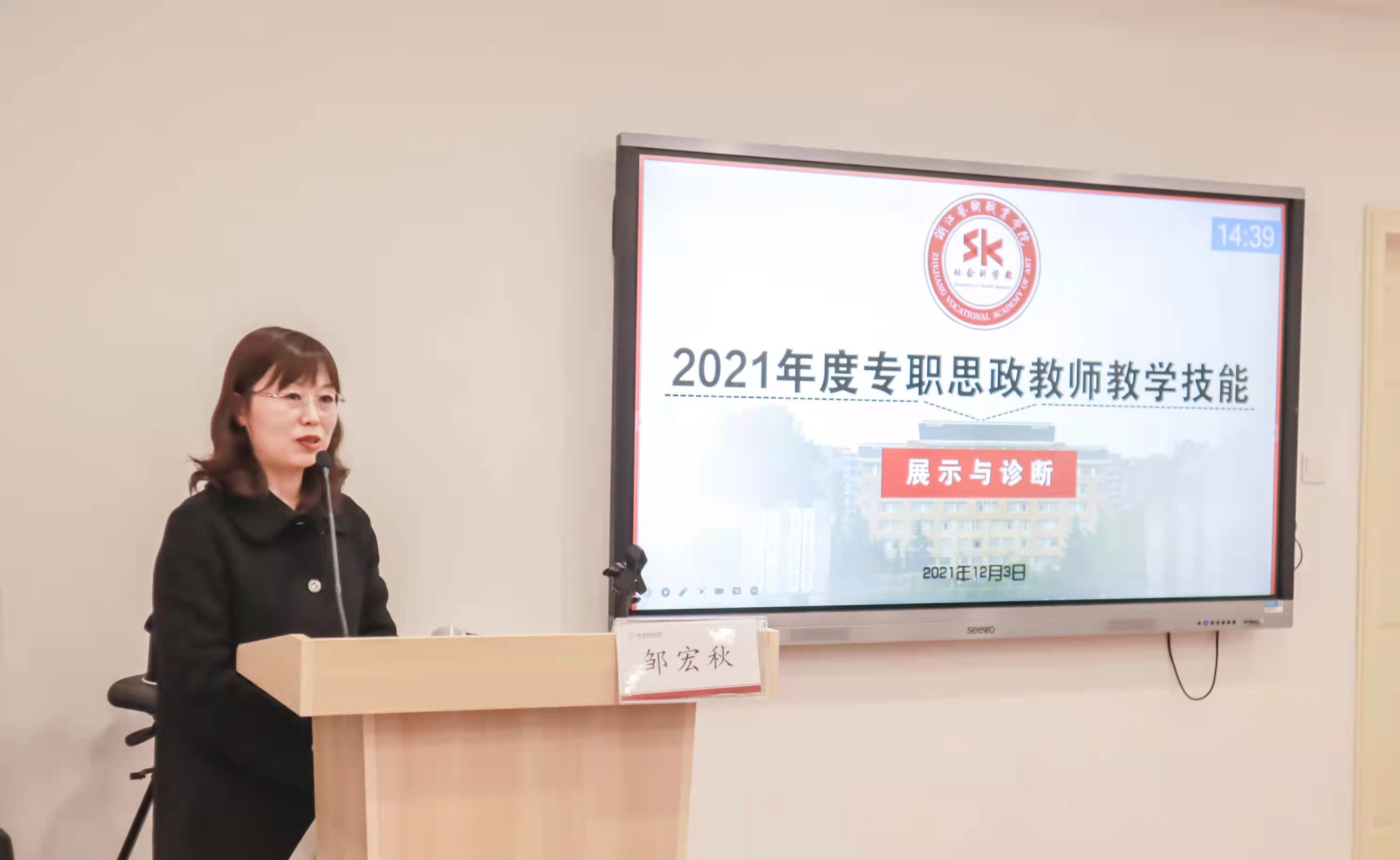 12月3日,社会科学部2021年度专职思政教师教学技能展示与诊断活动按计划在学校图信中心第2研讨室举行。活动邀请教育部2021-2025年高校思政理论课教学指导委员会高职高专分教指委委员、全国首批高校思政理论课名师工作室负责人、杭州职业技术学院马克思主义学院院长邹宏秋教授,浙江省高校思想政治理论课名师工作室负责人、浙江经贸职业技术学院马克思主义学院副院长王兆婷副教授以及2021年浙江省第九届高职高专院校思想政治理论课教师教学技能大赛一等奖获得者、浙江经贸职业技术学院马克思主义学院青年教师叶紫莅临指导。社会科学部思想政治理论课部分兼职教师、党校班主任、新进教师20余人观摩了此次活动。
