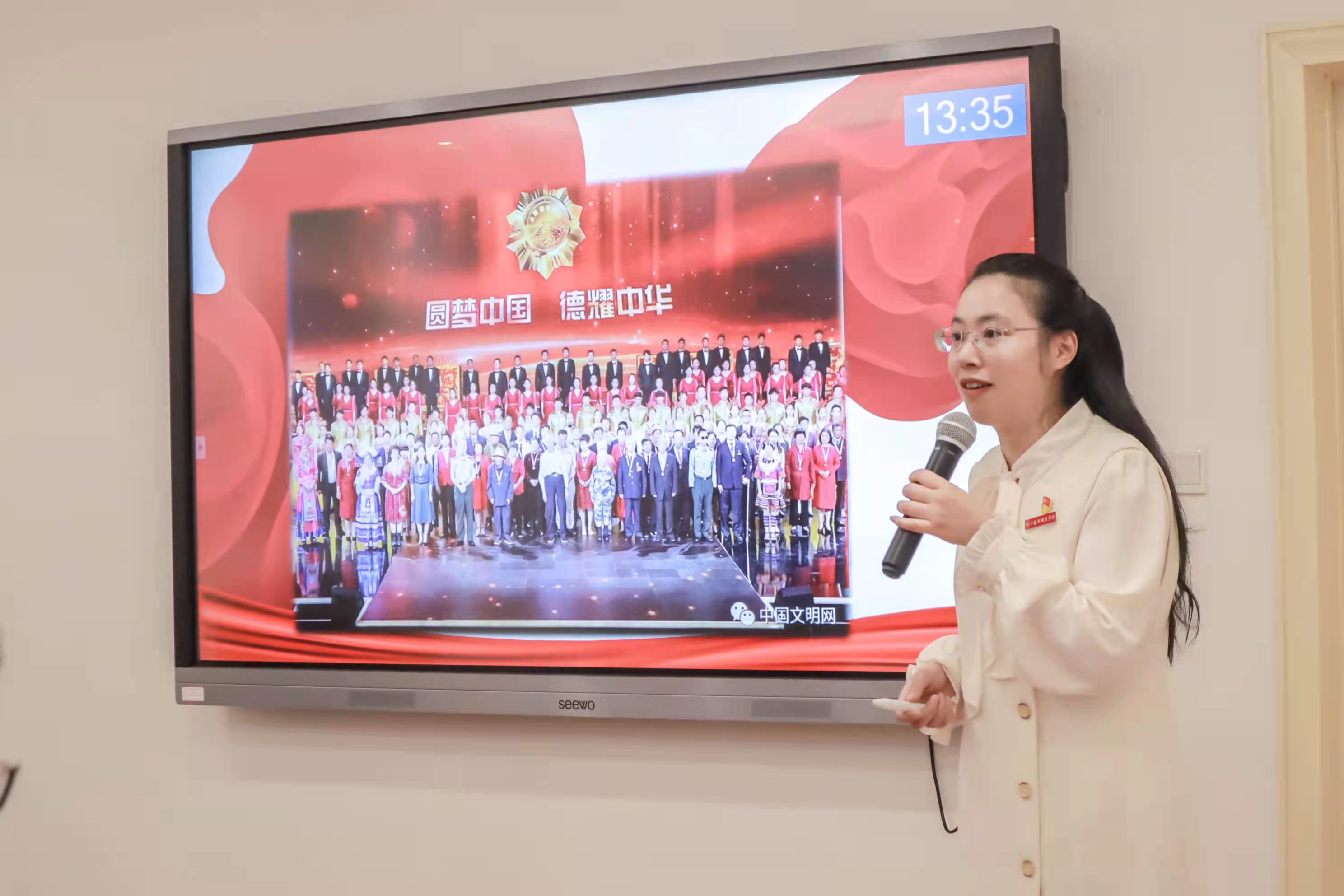 叶紫在示范教学环节中作《青春中国  吾辈当歌——为中国梦注入青春能量》的教学展示,她讲述了在新时代的中国,青春一代的大学生,应“以青春之我,创建青春之国家,青春之民族”,从三个角度解答了青年大学生的困惑--身处平凡岗位,应该如何为实现中国梦注入青春能量:敢于有梦,立鸿鹄志;勇于追梦,心怀“国之大者”;努力圆梦,实干兴邦。叶紫精彩的教学设计、生动的现场讲授和富有创造力的信息化互动方式,赢得了在场教师的一致好评。