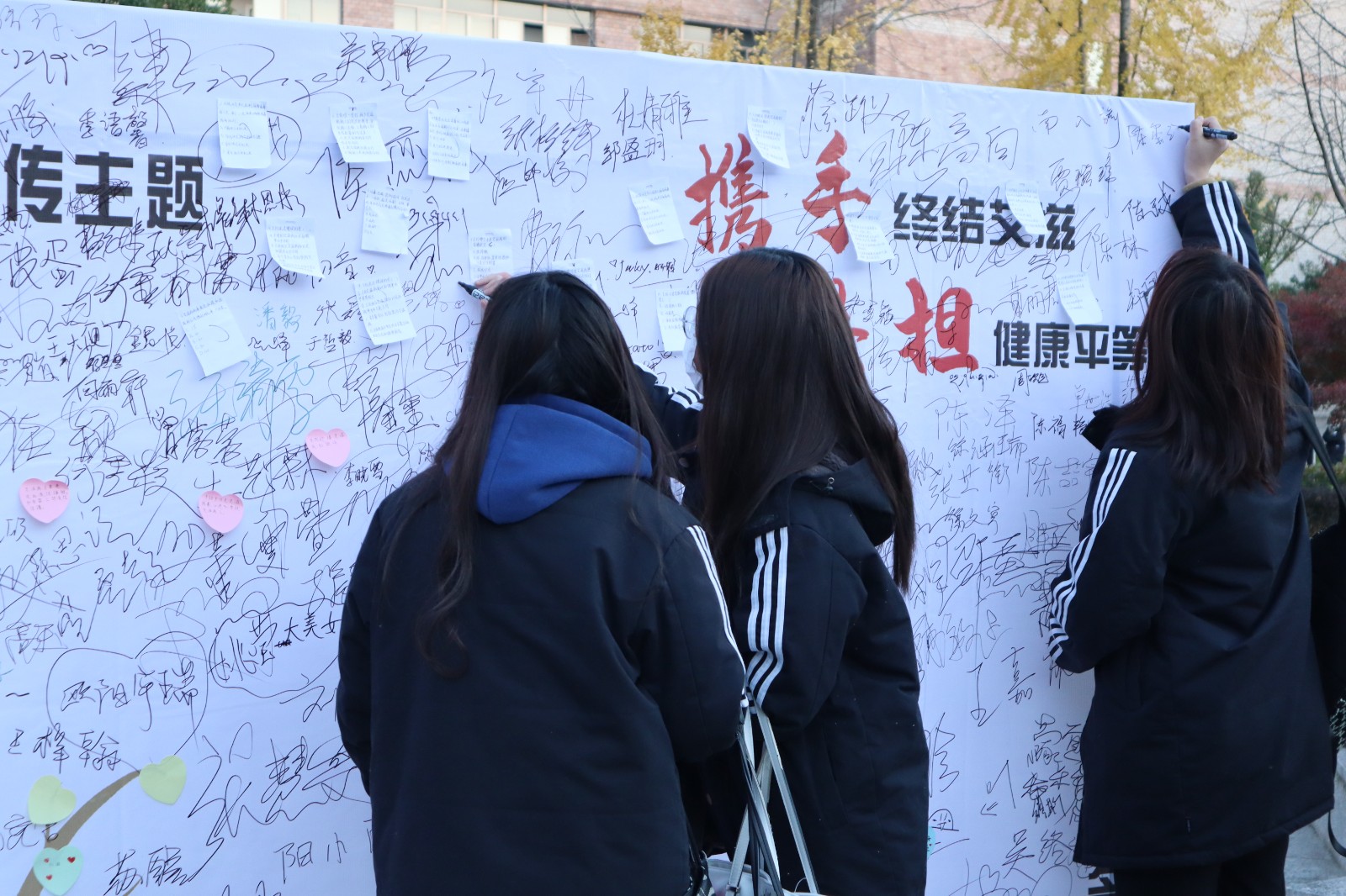 防艾知识宣传。12月1日起,校团委在学校中心广场设立防艾宣传点,向全校师生宣传防艾相关知识。身穿玩偶服的“艾滋病感染者”和大家互动拥抱,充分地让大家正视、尊重艾滋病感染者。往来的同学们更是在签名版上留下了自己对艾滋感染者的心语心愿。