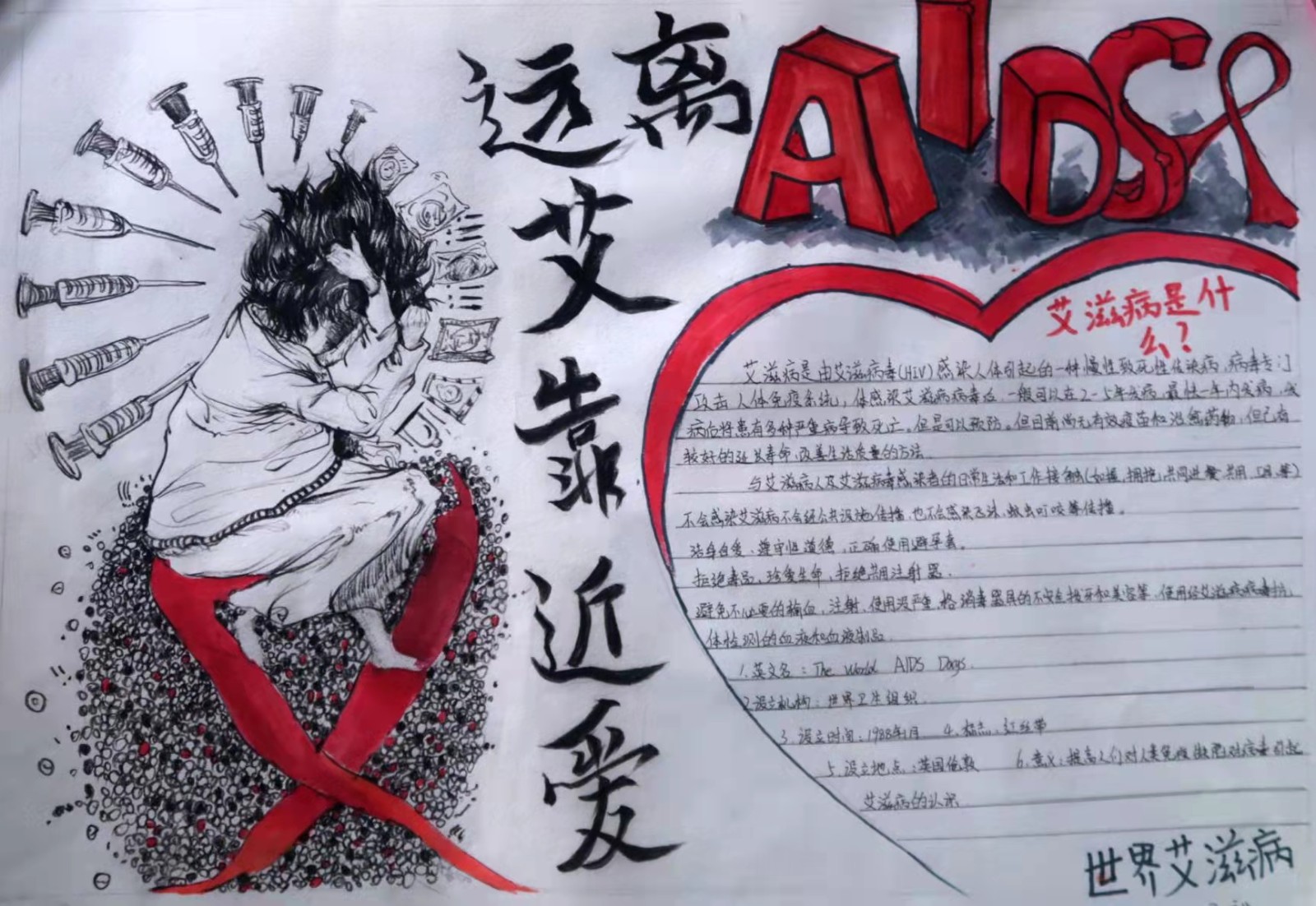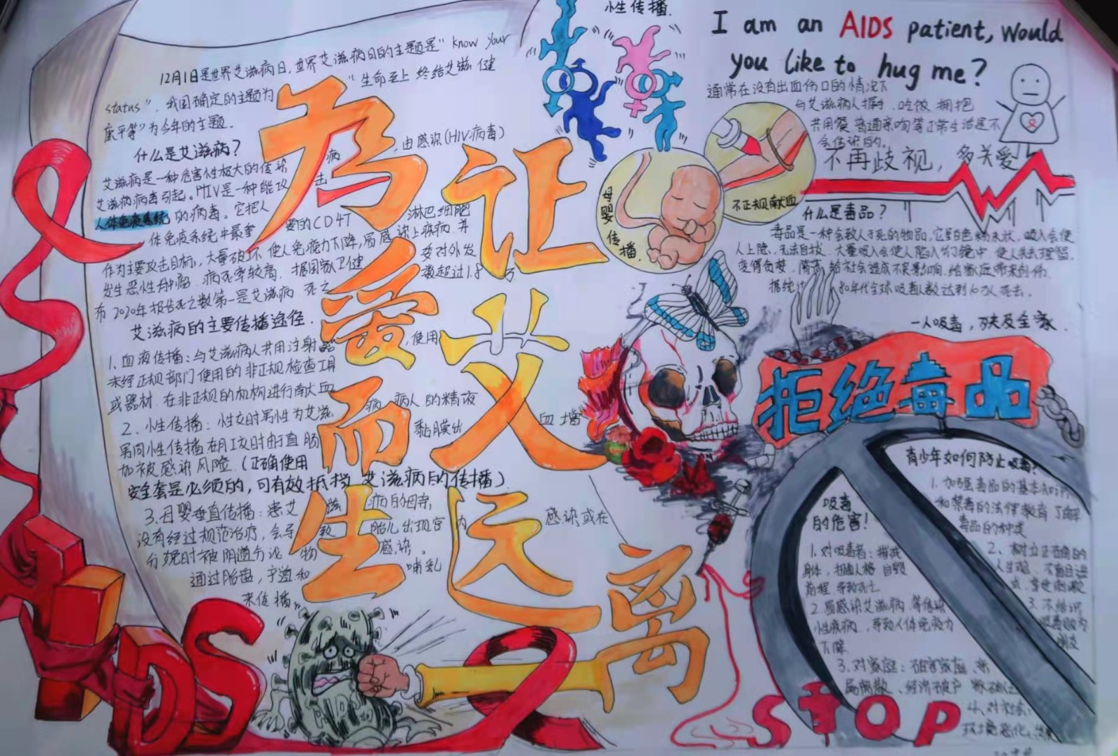 “防艾禁毒青春健康知识”手抄报比赛。为了更好的宣传预防艾滋病,也为了更好的让防艾关“艾”进校园,11月25——12月6日,校团委面向全校同学征集防艾禁毒手抄报,通过绘制海报的形式来让更多的同学了解艾滋病,正视艾滋病。在此次防艾公益海报设计比赛中,同学们充分展开了想象和设计的翅膀,踊跃投稿,设计出一系列契合主题、直观生动的宣传海报。