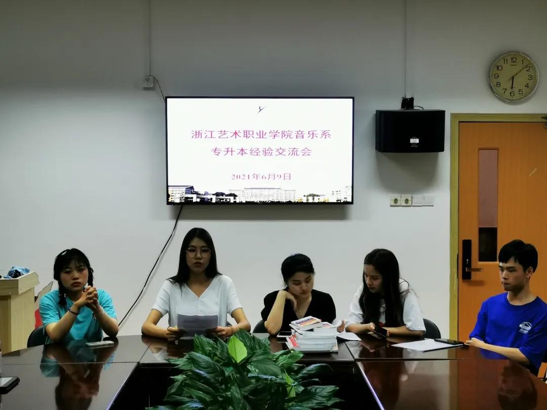 交流会由音乐系辅导员主持,大二、大一意向专升本学生参加会议。五名专升本同学代表分别为:戚晓凡,被浙江音乐学院表演(越剧音乐伴奏)专业录取;林晨,被浙江音乐学院音乐表演(流行演唱)专业录取;潘森怡,被浙江音乐学院音乐表演(声乐演唱)专业录取;董茗嫣,被温州大学音乐学(师范)专业录取;王艺燃,被绍兴文理学院音乐学(师范)专业录取。她们将自己的学习方法和成功经验分享给学弟学妹们,从报考院校及专业、考试科目、考前资料收集、参加校外辅导班等方面和大家进行了交流,并针对平时的学习方法及专升本复习期间的心态调整等问题给学弟学妹们提出了建议。恳切的言辞、幽默诙谐的谈吐,让同学们在轻松的氛围中详细了解到应该如何准备专升本考试。