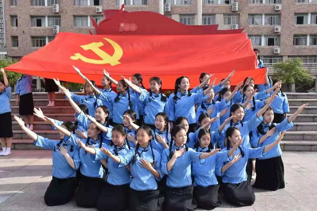 紧接着,朗朗诵读声中,2019级小百花班全体女生身着蓝色学生服,以戏曲人独有的方式,声情并茂地演绎了越剧版《唱支山歌给党听》,优美婉转的歌声在清晨校园中回荡。台上,鲜艳的党旗迎着朝阳徐徐展开,台下,师生们挥舞着手中的红星。就这样,鲜红的党旗、鲜艳的国旗、殷红的红星在朝阳之下熠熠生辉、交相呼应。