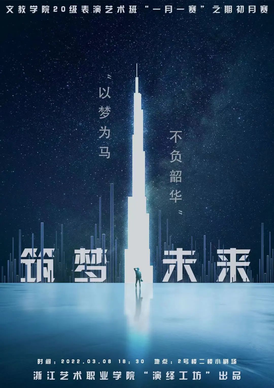 2022年3月8日,文教学院20表演艺术班将在2号楼二楼小剧场举办“一月一赛”之筑梦未来之期初月赛。