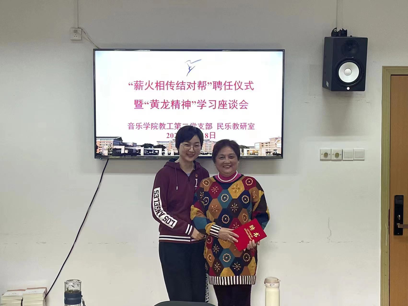 4月18日,音乐学院教工第二党支部、民乐教研室在3101党员之家举行“薪火相传结对帮”聘任仪式暨“黄龙精神”交流分享。吴樟华、朱学富、陆曙鸣、马崊等4位正高职称党员教师受聘结对4名青年教师,并作“黄龙精神”与教书育人心得分享。支部党员、民乐教研室全体教师参加。