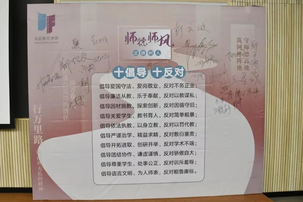 全体教师签署了《戏剧影视学院师德师风个人承诺书》,在师德师风,立德树人——“十倡导 十反对”倡议展板上签字,郑重承诺以德立教、廉洁从教、静心教书、潜心育人,争做“四有”好教师。