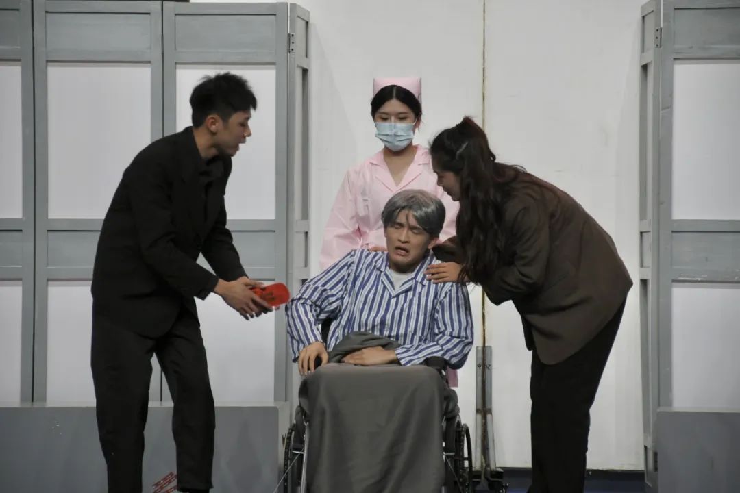 三位演员叙述了主人一次次损失头发的故事,但背后代表的,是天天加班、压力过大的当代职场人群像,隐喻了现代人的高压工作环境。