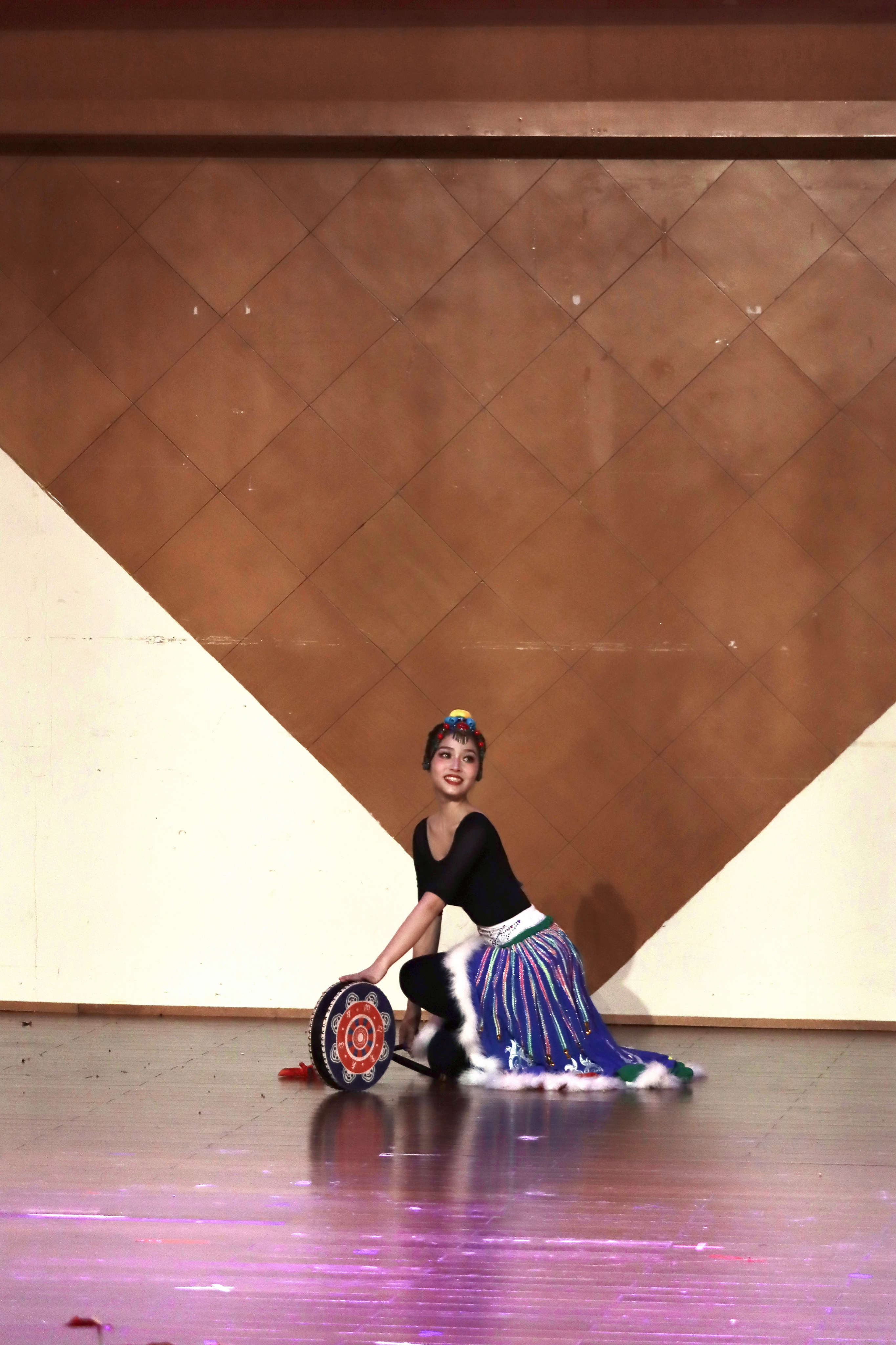 20歌舞班黄伊辰演唱新疆歌曲《打起手鼓唱起歌》,穿着一身新疆民族的服饰,拿着手鼓上场,把观众带入鲜花怒放碧草无垠的美丽新疆;展示傣族舞《花儿》展示傣族女儿该有的灵动和令人陶醉的柔美。