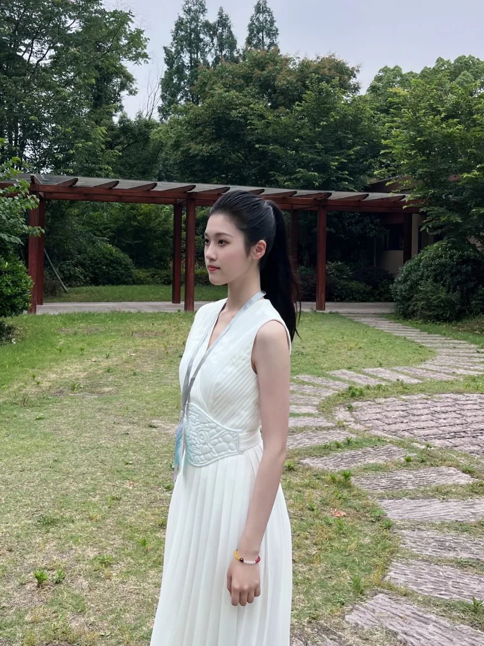6月15日9时18分许,何伊如身着白色长裙,长裙的材质为丝绸,与良渚文明贵族衣物的材质相同,长裙腰部收束,图案为良渚文明的高级宗教象征——神人神兽徽记,项链配饰的造型以良渚玉璜为原型,她说:“身着充满中华传统文化元素的服饰,神圣感和光荣感油然而生,日后我会一直带着这份荣光,将其融入自己的学习和生活中。”