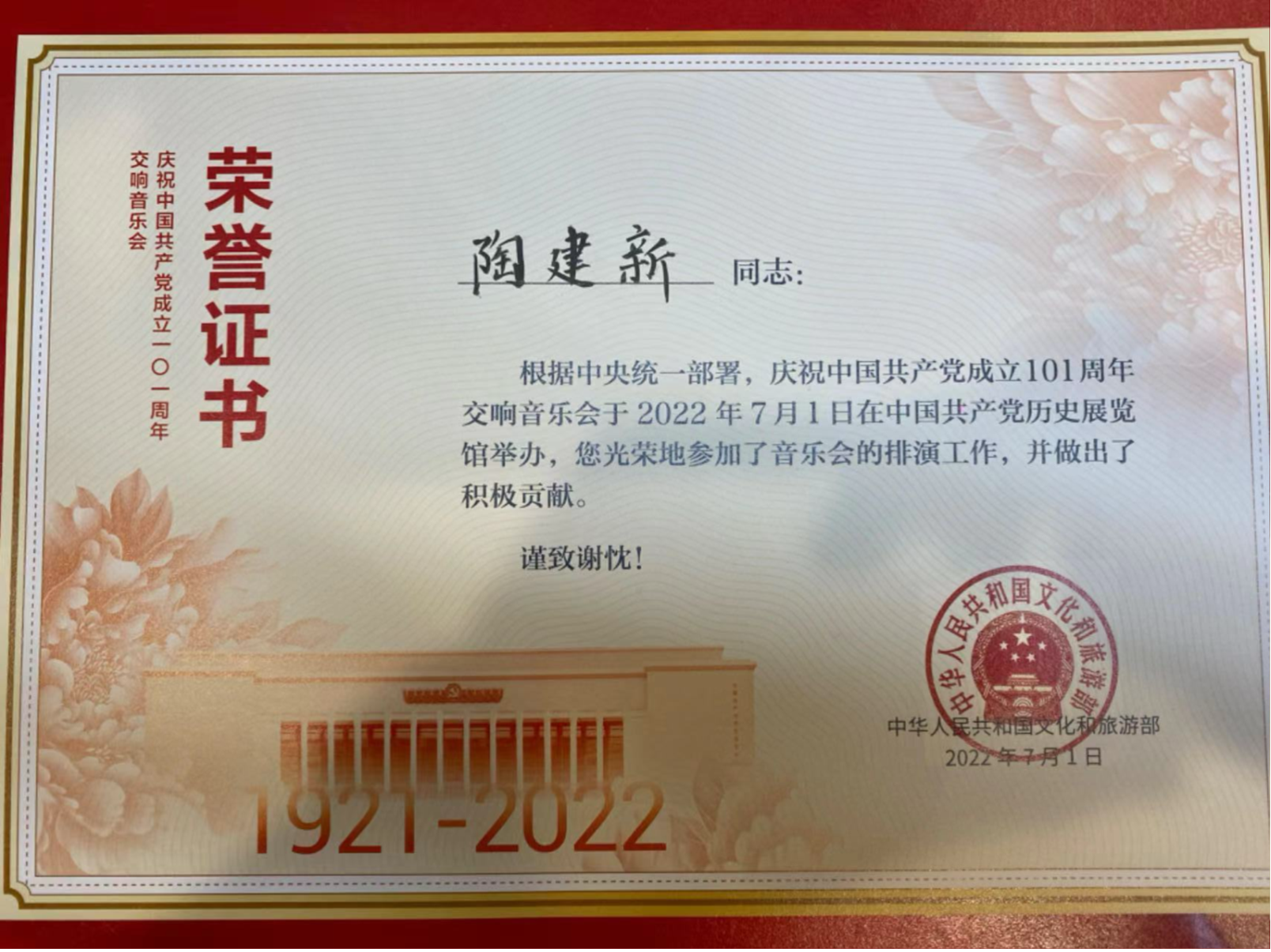 2021年,中国共产党成立 100 周年庆典如期举行,陶建新再次带领团队站上天安门的舞台。